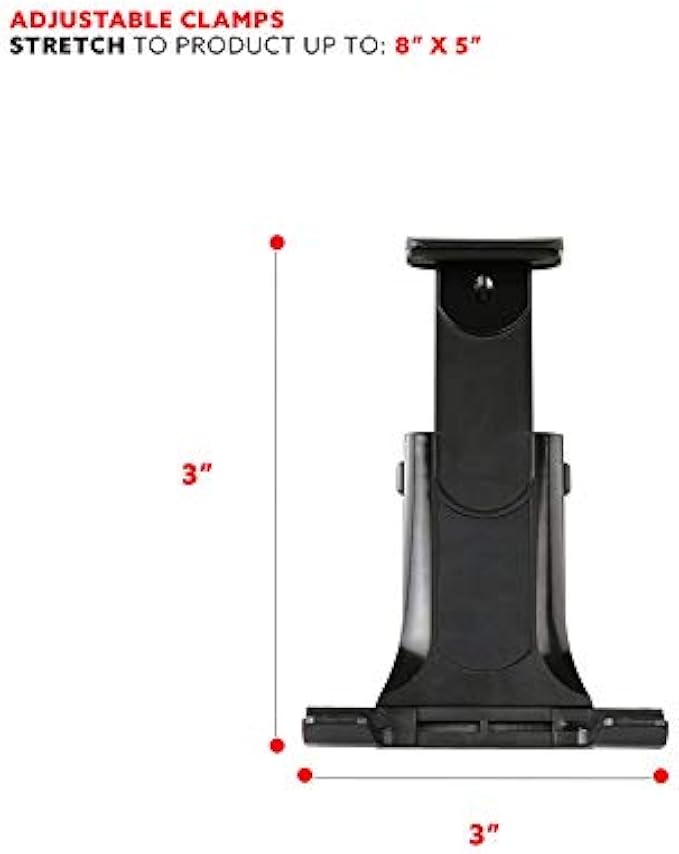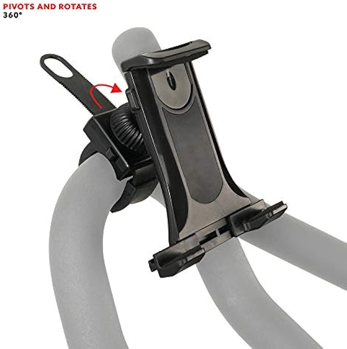 ADJUSTABLE: The top of the clamp holder easily slides up or down to fit the height of your device. The adjustable leg clamps adjust 3 inches in width to match your larger tablet devices. The cushioned accessory keeps your cellular device or tablet safe and secure from accidentally dropping while you are exercising. The swivel ball head attached to the strap allows you to adjust your device horizontally or vertically to better suit your viewing needs.
