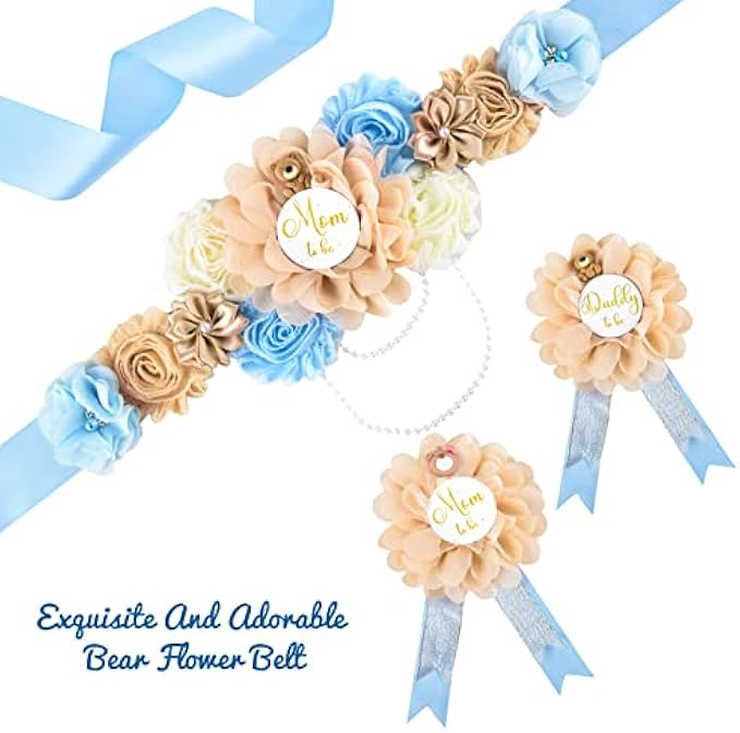 • 【Perfect Design】: The teddy bear maternity belt is decorated with teddy bears, beautiful flowers in brown, blue, off-white, embellished with rhinestones and pearls, with a great sense of design. The corsages of expectant mothers and fathers are also decorated with teddy bears.