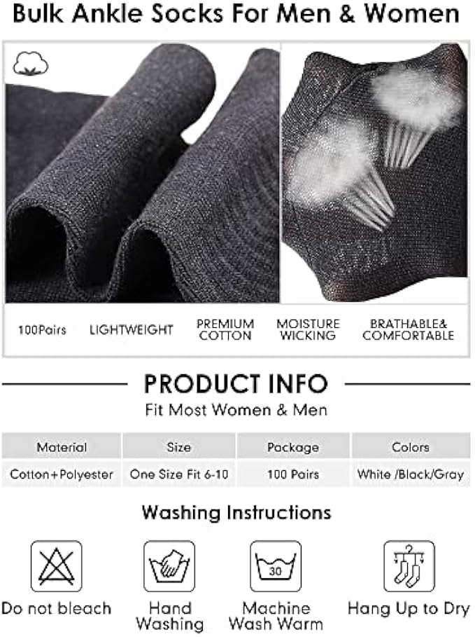 Polyester Imported Machine Wash Sufficient quantity: the package includes 100 pairs of bulk socks in solid color, enough quantity to meet your daily wear, replacement and sharing needs Quality material: these athletic ankle quarter socks are made of polyester fabric, soft and breathable, no odor, with great function of moisture wicking that will keep your feet dry and fresh, suitable for all seasons Classic and versatile: our mens socks bulk are designed in simple and classic solid colors, making it easy to match different shoes; The quarter cuff design strengthens the protection of the ankle joint to effectively prevent sprains, making it more flexible to match a variety of styles of shoes such as sneakers, boots, running shoes, and flats Practical gift: our everyday casual socks are stretchy and fit most men and a few women, and can be a practical and thoughtful gift for your brother, lover, father, friend or other family member;100 Pair bulk socks for homeless unisex, team, charity events, parties, competitive events and more Suitable for most occasions: our quarter running socks for men and women, are suitable for outdoor activities and daily leisure use, such as running, walking, working, exercising, tennis, fitness, traveling, hiking, biking, outdoor sports, and so on