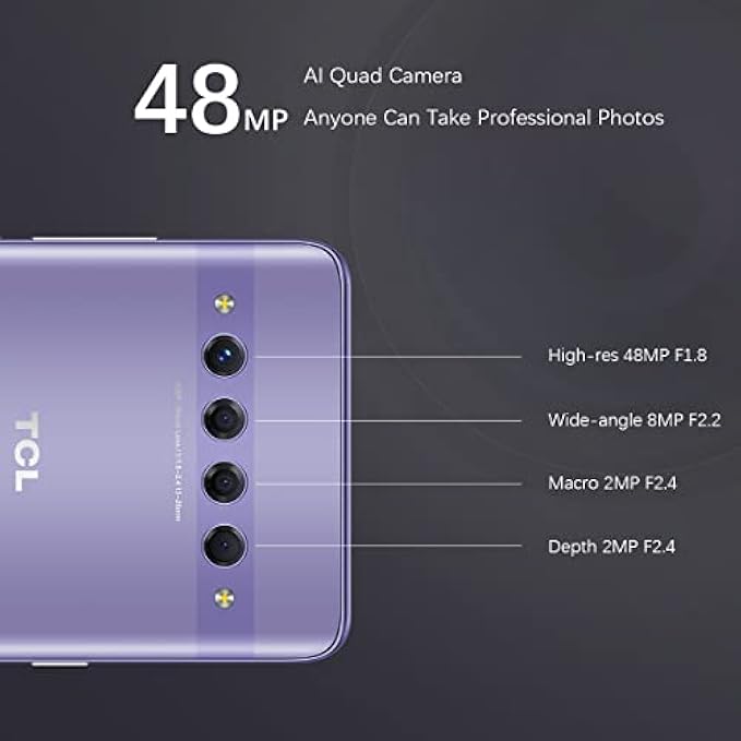 • 【Intelligent AI Quad-Camera】TCL 10 Plus features a 48MP high-res camera with AI scene-detection algorithm. The main camera lets you capture sharp resolution and detail while identifying and enhancing scenes and objects to create the highest quality image possible. The world is yours to capture with a 48MP AI Quad-Camera capable of shooting in extreme lighting conditions.