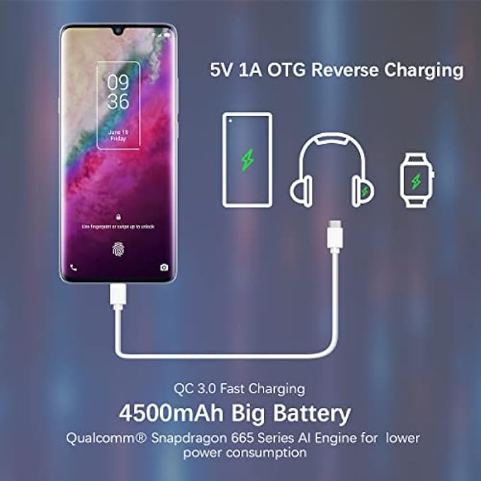 • 【Powerful Big Battery&18W Fast Charging】TCL 10 Plus features a powerful 4500mAh big battery. The phone supports 18W (9V2A) QC3.0 fast charging which can charge up to 50% in 40 minutes.And it also features 5V1A OTG reverse charging to power up headsets, wearables and other phones.