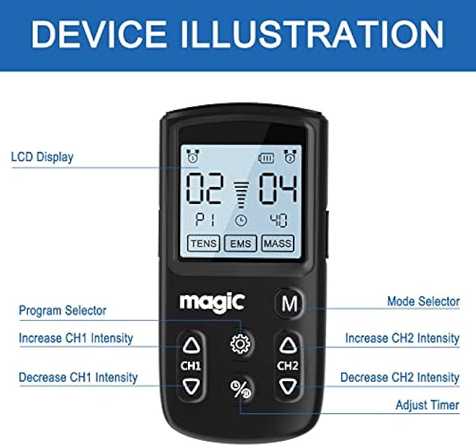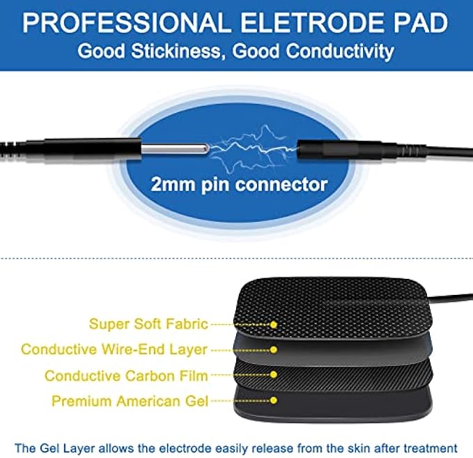 Multi-functional & Professional: Tens Electric Massager with 22 Modes, 40 Levels Intensity for Pain and Muscle Relief. TENS unit help relieve pain associated with sore and aching muscles in the shoulder, waist, back, neck, upper / lower extremities(arm/leg) due to strain from exercise, overwork or normal household work activities. Activate specific natural pain gate mechanism, relax your body anytime you feel the need with our professional grade TENS electrotherapy pulse massager and accessories A/B Dual Channels: You can operate it with different intensity settings for each channel to pain relief therapy. With portable size, it can be used in home, office, driving or travelling. It is with human body simulation technology, microcomputer intelligent control technology, simulates a variety of massage methods. The Tens Unit is also intended to be used to stimulate healthy muscles in order to improve and facilitate muscle performance Upgrade TENS Electrode Pads: Our TENS Unit Replacement Pads has been upgraded to the industry leading adhesive, which can provide much better self-stick performance and easy clean up for longer lifespan. It quite easy to find compatible electrodes (2mm pigtail tens unit pads) on the market for you to choose from Powerful Battery: Package includes a USB cable (No Adapter) that can be connected to a wall charger, power bank or laptop USB port to charge. One charge provides 10 hours of useage, which is more environmentally friendly than AA batteries and lasts longer than other machines. Our Tens Unit with charge level indicator to remind you to charge in time What You Get: 1 x TENS Machine, 10 x Square Electrode Pads(2"x 2"), 2 x Lead Wires (1/2 Wire), 1 x Machine Holder, 1 x USB Cable, 1 x Professional User Manual, 1 x Lifetime Warranty Service. Our team of professionals is ready to help you with any issues with our TENS Unit Muscle Stimulator, if you have problems, please contact us directly. Enjoy a high-quality product with confidence, your safety and experience is our top priority, we got it all covered