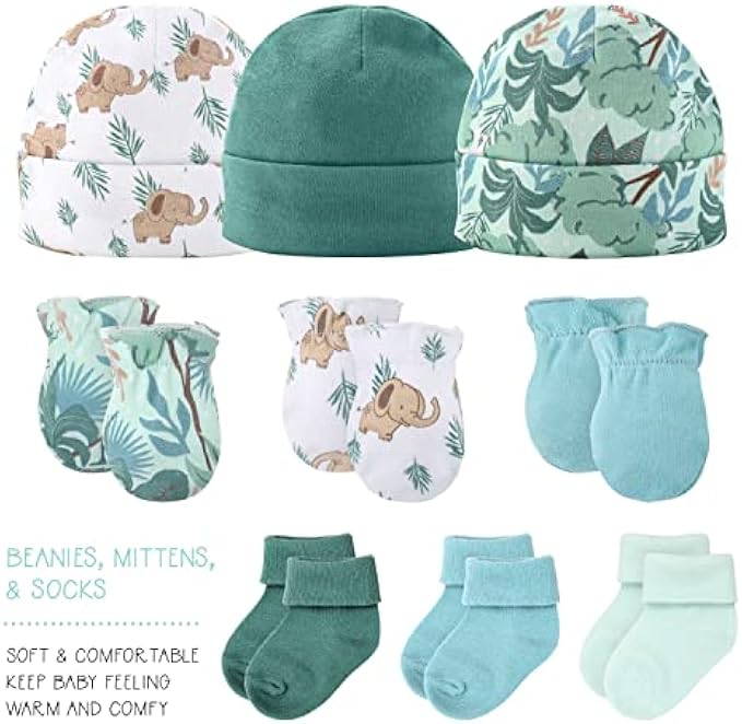 • 16 MUST HAVE ACCESSORIES: This adorable gift set has all the clothes and accessories you need for a new born baby boy or girl. It includes 3 short sleeve bodysuits, 3 pair of pants, 3 beanie hats, 3 pairs of scratch mittens, 3 pairs of socks, and a sleep gown