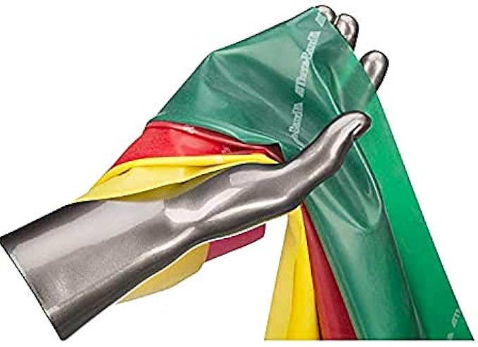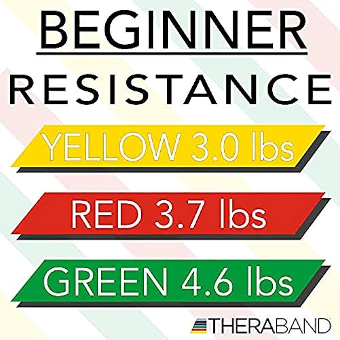 Each band measures 5 Foot long X 5 Inch wide and comes in three color-coded resistance levels: Yellow-3-4.3 lbs.; Red-3.7-5.5 lbs.; Green-4.6-6.7 lbs.