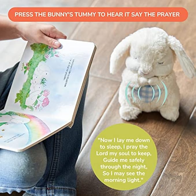 PRESS MY TUMMY & PRAY WITH ME BUNNY: Measuring at 7 inches tall, this bunny is made of luxuriously soft plush fur with embroidered details and a beautiful pink rose flower accent. With its hands in a praying position, this bunny recites the prayer "Now I Lay Me Down to Sleep" in a sweet little girl's voice when you press its belly. It makes for a wonderful baptism or christening gift, as well as an adorable Easter gift for girls.