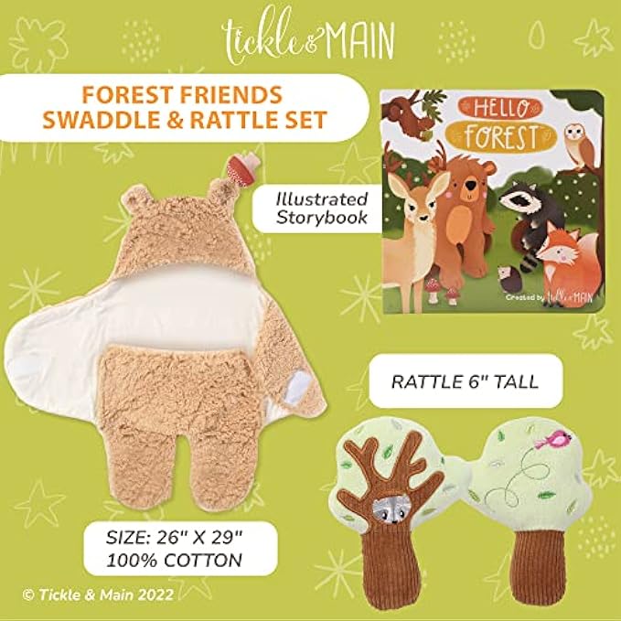 COMFY SWADDLE & SOOTHING RATTLE: Wrap your precious baby in the utmost comfort with our snuggly 100% cotton swaddle blanket, measuring a cozy 26” x 29”. Its gentle embrace will provide warmth and security. Delight your little one with our sweet friendly tree rattle, standing 6” tall and producing soft shaker sounds, creating a soothing atmosphere. These thoughtful and adorable newborn baby gifts are perfect for creating cherished moments in the magical world of infancy.