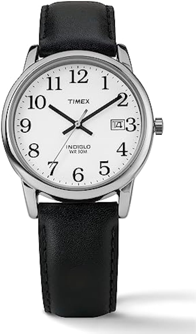 • Adjustable black 18 millimeter genuine leather strap fits up to 8-inch wrist circumference