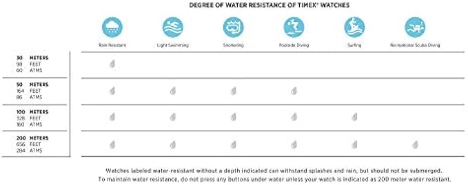• Water resistant to 30m (100ft): in general, withstands splashes or brief immersion in water, but not suitable for swimming or bathing