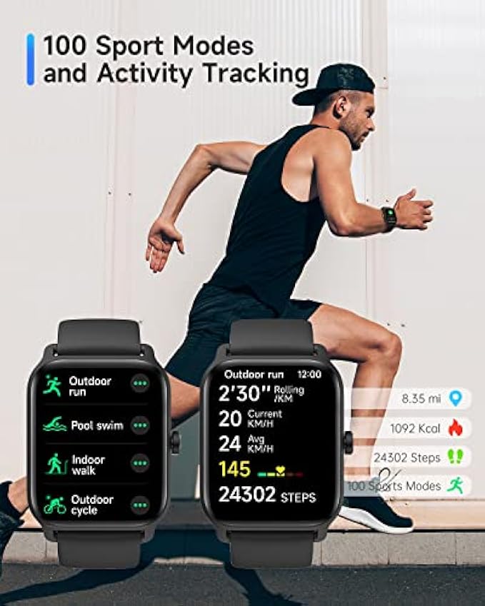 Alexa Built-in: Access multiple functions instantly by talking to Alexa. Set reminders, check the weather, start workouts, music control, and manage all your Alexa-compatible smart devices with ease. To experience the future of smart living, download and install "VeryFit" for free from App Store or Google Play. Real-Time Fitness & Activity Tracking: Stay on top of your health and activities with 24/7 real-time monitoring of your heart rate, blood oxygen, stress. Effortlessly keep tabs on your physical fitness goals by tracking your calorie burn, step count, and exercise records. The fitness watch supports 100 sports modes, you can track a wide range of activities, from running, cycling, strength training, to swimming and more. With an IP68 waterproof rating, you can wear this fitness tracker while swimming or diving up to 5-10 meters. Multi-Stage Sleep Monitoring: Get the inside scoop on your sleep with this activity tracker's detailed analysis of your sleep quality and duration in different stages(Awake, REM, Light sleep, Deep sleep). Take control of your sleep and wake up feeling refreshed and ready to take on the day. Long Battery Life: 7-10 days of battery life under normal usage, 20 days in power-saving mode, and up to 30 days on standby makes our smartwatch a perfect companion for your active lifestyle. Stay Connected and Hands-Free: Get all your important notifications on your wrist in real-time, whether it's SMS, email, or social media. With Bluetooth compatibility, you can also make and receive calls without reaching for your phone. Our smart digital watch is android phones and iphone compatible. 1.8'' HD Screen & Customizable Watch Face: Boasting a stunning 1.8'' HD full touch screen. With a plenty of gorgeous watch faces to choose from, as well as the ability to customize it by uploading your own photo, our smart watches for men&women offers the ultimate in style and versatility.