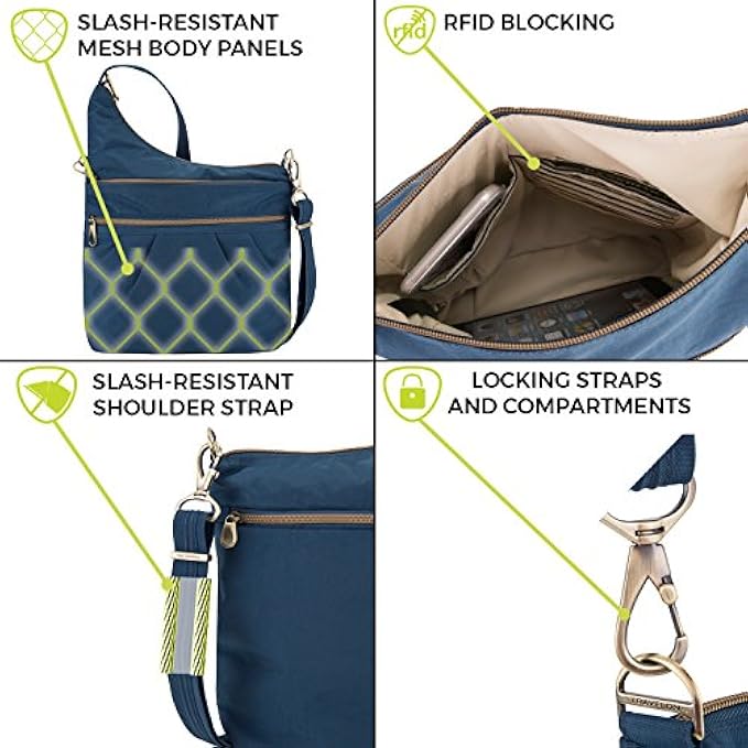 • Full anti-theft features include surround slash-resistant body panels and shoulder straps; locking compartments; lock down strap; and RFID blocking card and passport slots and pockets