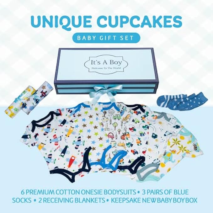 High-End Gift for Your Little One - Essential baby boy gift items for your bundle of joy: 6 premium all cotton baby bodysuits, 3 pairs of cute socks, and 2 soft receiving blankets, plus our exclusive heavy-weight It’s A Boy box to showcase your delectable baby cupcake gifts and store baby keepsakes. Size 3M.