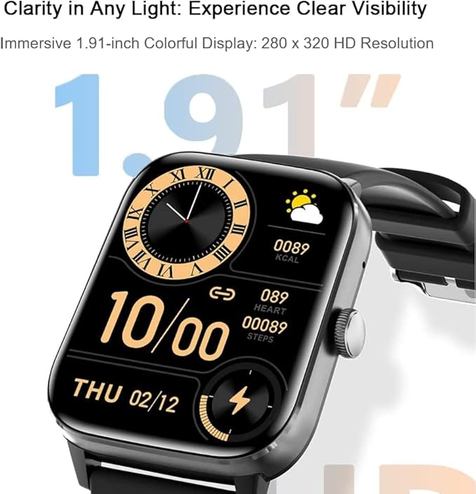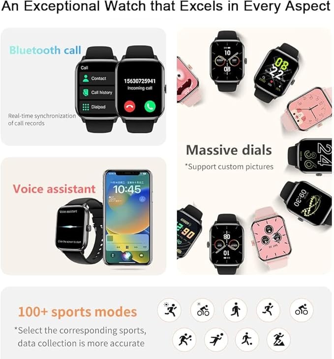 Upgraded(QS11) Bluetooth Call Features: Effortlessly sync your phone's contacts, make/receive calls, view call history, and redial with this advanced smartwatch. Stay connected without the need to reach for your phone. Innovative Non-Invasive Blood Glucose Monitoring: Utilizing PPG bio-tracking optics and temperature sensors, the watch gathers skin surface light intensity and temperature changes to estimate your current blood sugar levels. Please note that non-invasive blood glucose measurement technology is still in development and may contain certain inaccuracies. Comprehensive Health Tracking: Monitor your heart rate, blood pressure, body temperature, and blood oxygen levels throughout the day, ensuring you remain in control of your well-being. Note that the temperature test requires full skin contact with the sensor (10-minute wearing time) and is influenced by environmental temperature differences, serving as a warning only. Versatile Functionality: Discover a range of features, including women's health tracking, SMS alerts, app notifications, sleep monitoring, step counting, distance tracking, calorie counting, music playback, stopwatch, countdown, calculator, weather display, remote camera control, wrist-raise screen brightening, phone finder, 100+ sports modes, and dozens of customizable watch faces. 2023 Enhanced Edition: Featuring a 1.91-inch HD full-color touch screen, durable aluminum alloy shell, 22mm replaceable strap, RTL8763EWE high-precision chip, 260mAh long-lasting battery, IP67 waterproof rating, and a sleek design, this smartwatch is the perfect gift for yourself or your loved ones.