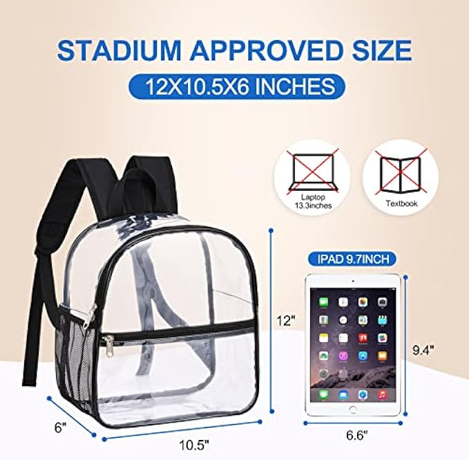 • 【Clear Backpack Stadium Approved】The main dual zippered compartment of this clear backpack measures 12"Hx11"Lx6"W, making it the perfect size for sport events, traveling, and work. It meets the stadium-approved size requirements, so you can easily take it with you to events and venues with bag restrictions.
