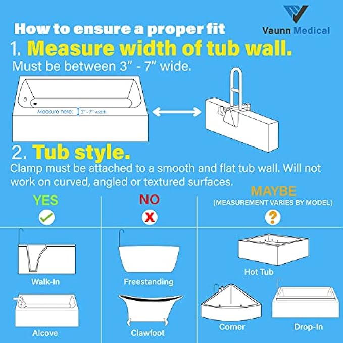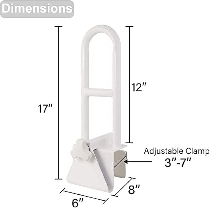 CUSTOMIZED FIT & TOOL-FREE ASSEMBLY– Width adjustable clamp allows tub rail to fit securely on any tub wall (3”-7” thick). Easy installation, no tools required. Tub rail will not leave unsightly marks or dents on the surface of the tub. Note: Not intended for use on fiberglass surfaces.