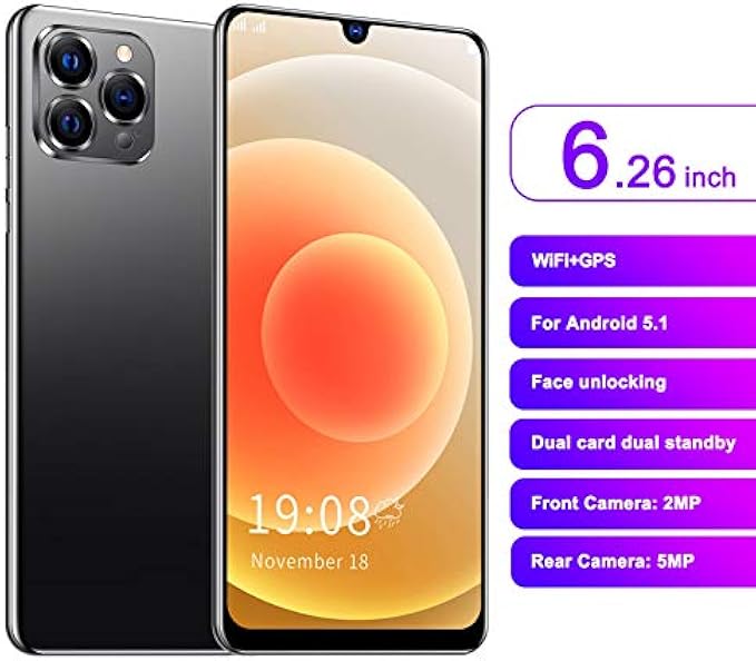 Vbestlife IP12 PRO Unlocked Android Smartphone,6.26in Waterdrop Full Screen Dual SIM Cell Phone,Ultra Thin Mobile Phone Supports Face Fingerprint Unlocking,Quad Core CPU,Triple Rear Camera Black