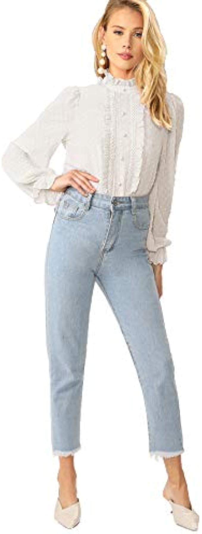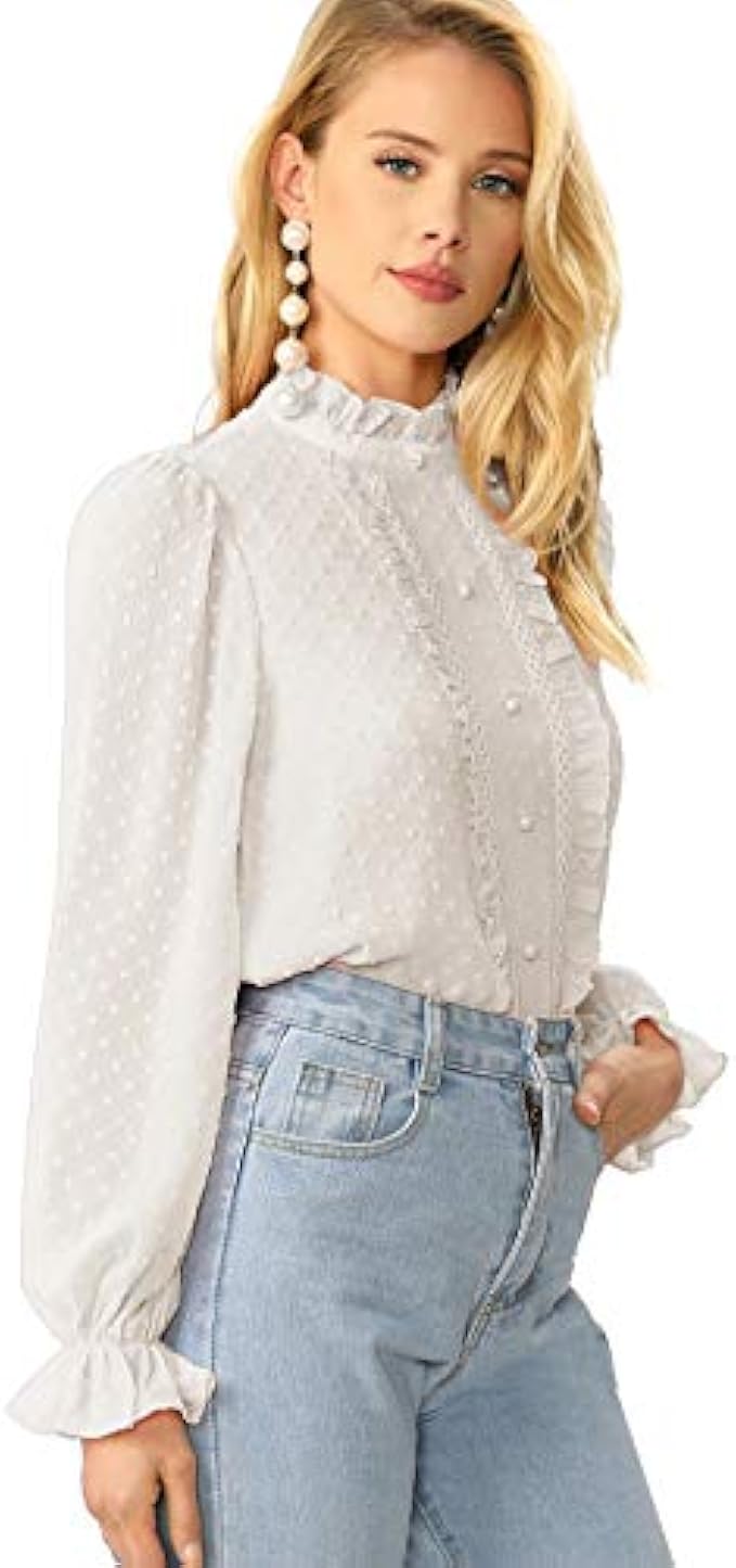 Verdusa Women's Elegant Ruffle Trim Long Sleeve Buttoned Front Jacquard Blouse
