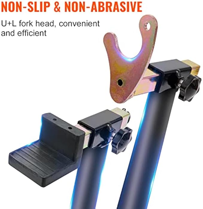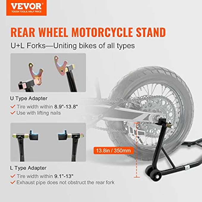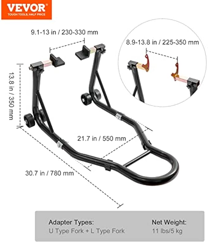 Adjustable Universal Fork Heads: The rear stand with U-shaped fork head support adjustable from 8.9-13.8 in (225-350 mm). And we provide a pair of L-shaped fork head, it can be adjusted from 9.1-13 in (230-330 mm). These versatile options provide stable support for both sides of your vehicle.