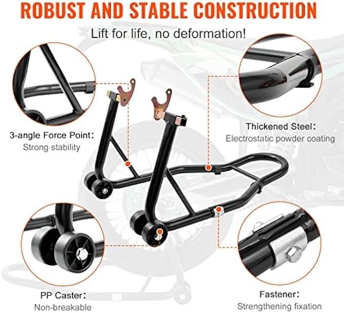 Easy Assembly & Use: Our motorcycle frame stand comes with a detailed assembly guide and a quick assembly process. Featuring four 3-inch PP casters and extended handles, you'll be able to lift your motorcycle effortlessly in just 2–3 seconds.