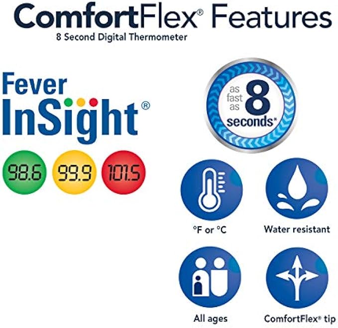 VERSATILE – With an 8-second turnaround time and flexible, comfortable tip, it’s great as a thermometer for adults as well as infants, toddlers and kids. ComfortFlex can be used as an oral digital thermometer, a baby rectal thermometer or under the arm.