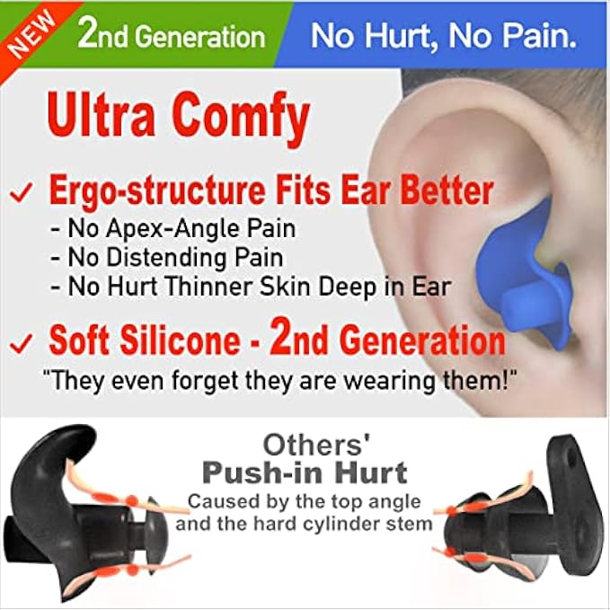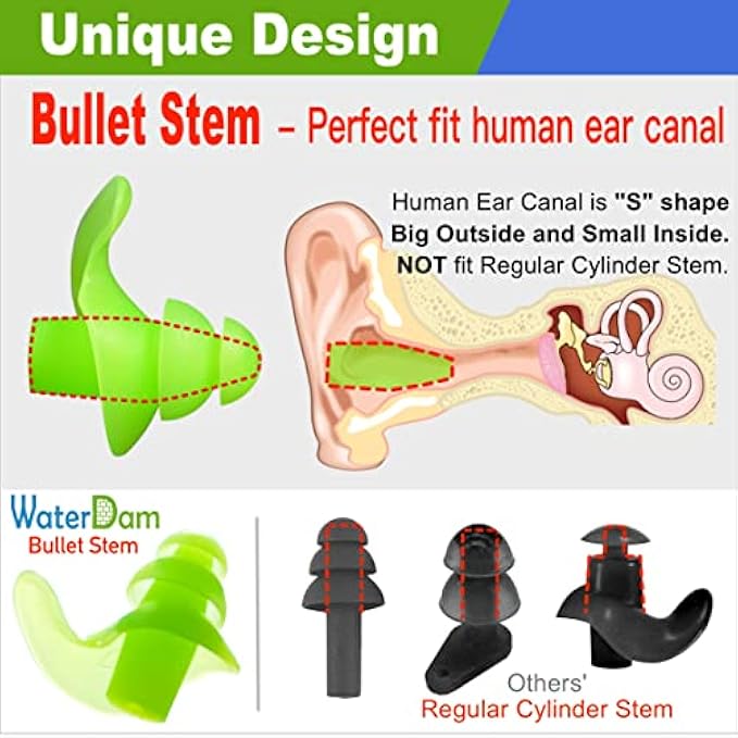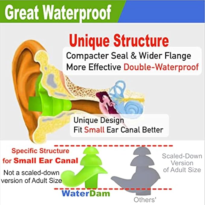 WaterDam Swimming Ear Plugs Great Waterproof Ultra Comfy Earplugs Prevent Swimmer's Ear (Size 1+2: Toddlers (Blue) & Small&Medium Ear Women Kids Teens (Green))