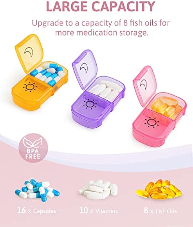Large Capacity --- Though each am pm pill container is large for 8 fish oils or 10 vitamins or 16 capsules, the whole pill holder is still compact for travel, and the outer case will secure your pills from spilling during the trip. (Whole size: 6.14" x 3.74" x 1.90", Single Size: 3.14" x 1.72''x 0.78'')