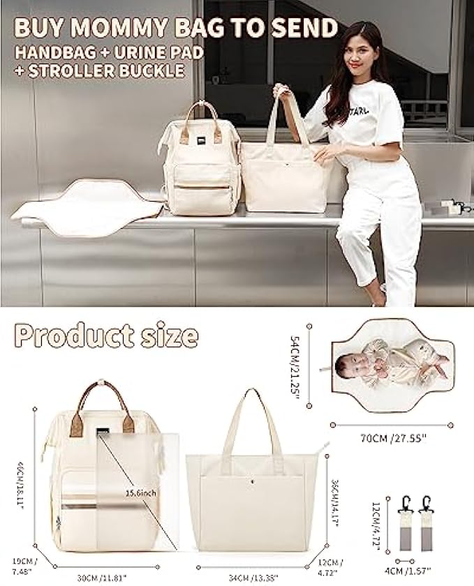 【What You Get】:Buy the mommy bag you will get four different things, which are 1 large capacity but light weight diaper bag + 1 tote bag + 1 diaper pad + 2 stroller hanging buckles,the size of the diaper bag is: 46*30*19CM/18.11*11.81*7.48"; the size of the tote bag is: 34*36*12CM/ 13.38*14.17*4.72", the size of the diaper pad is: 70*54CM/27.55*21.2*", the size of the stroller hanging buckle is: 4*12CM/1.57*4.72".