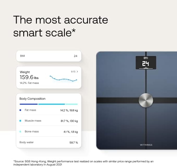 BODY COMPOSITION - The withings scale functions as a bmi measurement tool or body fat analyzer. This bathroom scale monitors weight, measures body fat & water %, muscle & more. It's a fitindex scale.