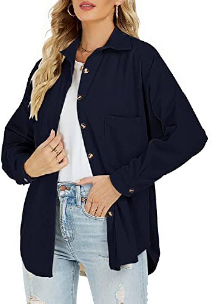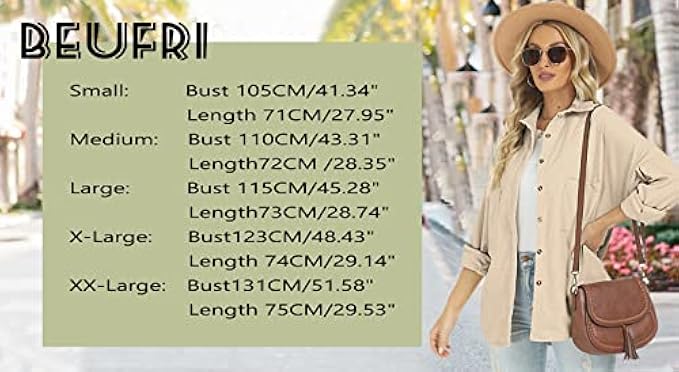 • Feature:this oversized Corduroy shacket jackets with Button front with pocket detail,long sleeves and button cuffs,solid color,boyfriend style,v neck cuffed sleeve,wear as 3/4 sleeves or full sleeve.The most amazing items you bought very comfortable and very nice shacket for a day