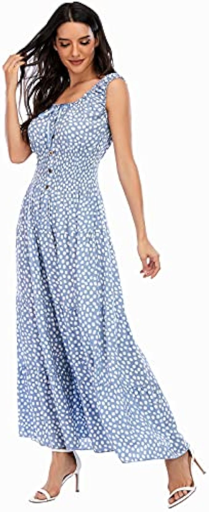 100% Viscose Imported Machine Wash Versatile Collar - Scoop Neckline, the most temperament collar in the dress, showing your graceful and intellectual beauty. Elastic rubber band collar with ribbon bow attaching the central front of the neckline, make you look stylish and elegant in any occasion. Bohomian Maxi Dress Design - Sleeveless ruffle sleeve hole and collar with buttons decorating on the central front, A-line style with flowy hem, as a boho beach dress for your vacation and daily wearing. Occasion - Perfect for daily wear, vacation, beach, pool, travel, dating, office, shopping, back to school, nightlife,commuting leisure time, parties, wedding or other occasions. Loose Fit Sizing - Dress:S=(US 4-6),M=(US 8-10),L=(US 12-14),XL=(US 16-18),XXL=(US 20-22). Wash Instruction: Hand/Machine washable with cold water recommended, do not bleach, iron in low, hang or line to dry.Softer to wear after washing