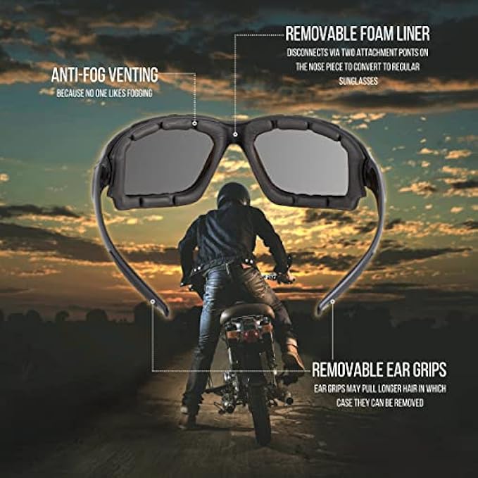 FEATURES - Removable wind resistant eye liner; Option to convert to goggles with included backstrap; Rubberized removable ear pieces help maintain stability and grip on users head; Lightweight design ideal for motorcycle and cycling bicycle, driving, running, fishing, racing, skiing, climbing, trekking, boating and/or other outdoor activities
