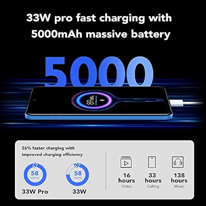 • MIUI 13 based on Android 11 Side fingerprint sensorAI Face Unlock 5000mAh (typ)33W Pro fast charging33W in-box chargerUSB-C