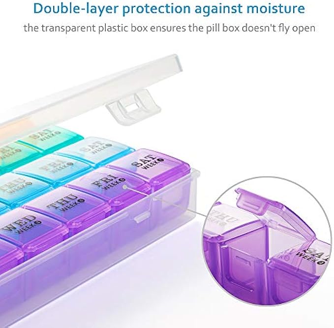 【 Weekly Pill Organizer 】For people who take lots of pills, can use this pill organizer as a weekly multi section pill box, there is a mark "1" "2" "3" "4"on the lid, means 4 times per day.