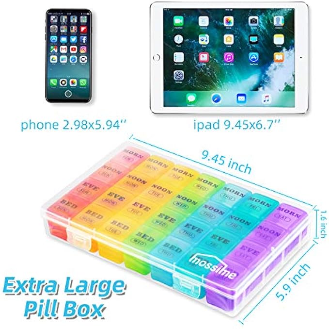 【4 EXTRA LARGE COMPARTMENTS A DAY】 This pill box comes with 4 large size compartment to meet your daily pill organizer request(morning, noon, evening, bed).Each internal compartment can storage 8 fish oils or 8 large vitamins. The size of the whole pill container is 9.45” x5.9” x 1.6" almost the size of 9.7" iPad.
