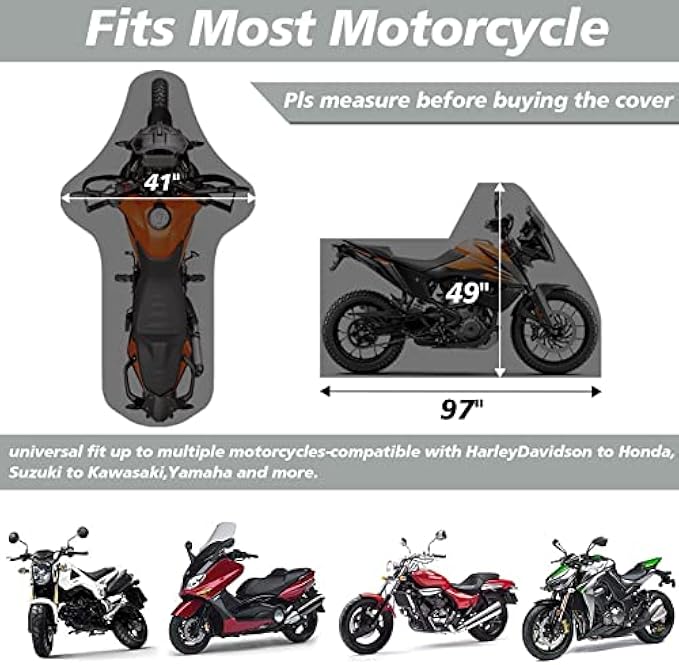 UNIVERSAL FIT-Designed to fit multiple motorcycles up to 97 inch—from Harley Davidson to Honda,Suzuki to Kawasaki,Yamaha and more—Our cover fits 99% on and off-road standard-sized bikes in USA market.