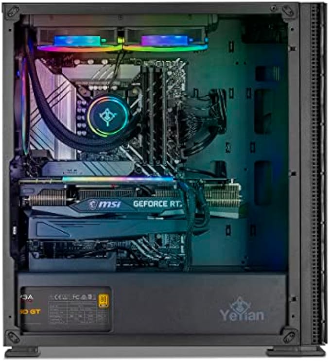 CASE & POWER: YEYIAN Shadow Gaming PC Case with Tempered Glass Side Panel – Black, 4x ARGB System Color Adjustable Ring Fans for Maximum Air Flow with Remote Control, Powered by 850W 80 Plus Gold Certified Power Supply, Case Measures: 17"x8.26"x19.4"