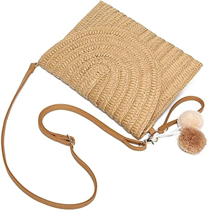 【Unique Fashion Design】This fashion straw crossbody bag, magnetic closure, 2 pompoms, mian pockets and a slot, a removable strap and the wrist strap of the bag side.