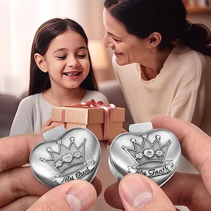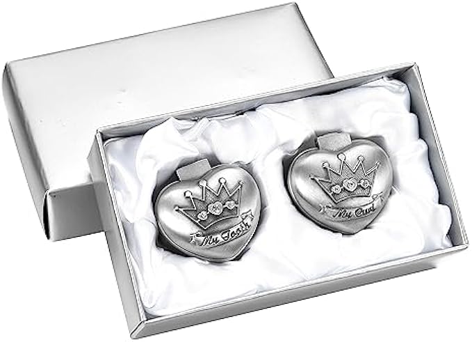 Keepsake Box Material: Made of zinc alloy, plated with silver, corrosion-resistant and durable. Two crown heart shape keepsake boxes cover carved with cute words: “My Curl” and “My Tooth”.
