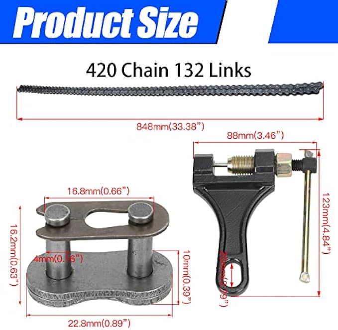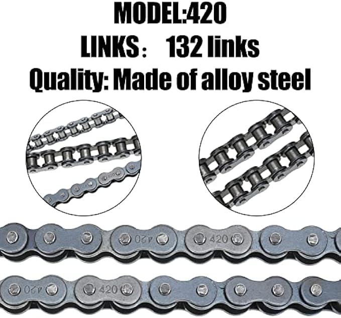 Size: 420 Chain, The 132 links include 66 internal links and 66 external links, Master link can be added or removed according to your needs, with installation tools attached.