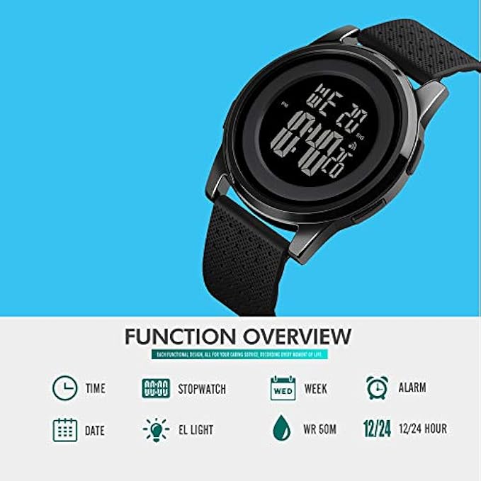Simple and easy-to-operate functions, with Waterproof, 12/24 hours switch, alarm clock, hourly alarm and daily alarm, Auto Date, Stop Watch, LED Light