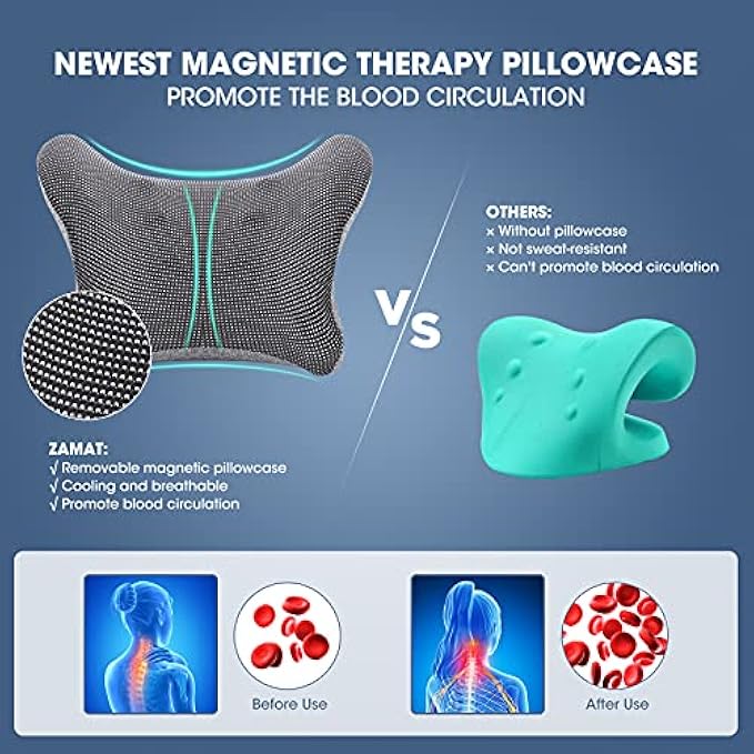 【10 MINUTES A DAY, KEEP NECK PAIN AWAY】Are you trouble with cervical spine problems, neck pain, headache and so on ailments that are caused by long time work? ZAMAT cervical traction pillow helps you soothe away the stiff neck, relax and rejuvenate neck and shoulders in 10-20 mins. Studies found that cervical traction devices significantly reduced neck pain. Now choose our neck relaxer, dramatically reduce your awful pain and stiffness without medication and unnecessary surgeries! 【SIMPLY ENJOY MAGNETIC THERAPY WITH ZAMAT PILLOW】The cervical pillow is covered with breathable and soft magnetic therapy cloth that implanted millions of permanent magnetic particles. It is not only sweat-resistant and cooling but also promotes blood circulation, eliminates neck pain and muscle stress, helps alleviate fatigue. Firm polyurethane foam gives the neck stable and flexible support. Both pillowcase and pillow of ZAMAT neck support pillow is machine washable, liberate your hands! 【ERGONOMIC DESIGN & SHIATSU MASSAGE】ZAMAT ergonomic cervical pillow conforms with the correct form of cervical spine, perfectly match with the human curve. When you lie down on it, it offers vertical, horizontal support and curves stretch for more complete neck traction therapy. Furthermore, 6 massage granules evenly right on neck muscle areas, provide an acupressure shiatsu massage to the cervical spine, greatly relieve cervical neck pain and stiffness, help cervical spine alignment. 【RELIEF YOUR PAINS EVERYWHERE YOU WANT】ZAMAT neck traction, your nice companion no matter at home, office, travel. Different from most traditional cervical traction systems, this neck support pillow for neck and shoulder pain is easy to use, just simply and comfortably lying down in couch or bed, even simply lean on this neck stretcher while working in front of computer. Its 0. 7 lbs weight and small size let you can carry it anywhere. Moreover, we also provide a storage bag. 【ATTENTION & CUSTOMER SERVICE】Please DO NOT use this as an ordinary pillow, DO NOT use it more than 20 minutes or all night. Normally you will need 1-3 days to adapt to this pain relief pillow because it needs time to fit your neck contour. This pillow is a versatile orthotic, helps in restoring proper cervical curvature, reliefing headache, cervical syndrome, TMJ, pinched nerves and so on. If you have any question with our product, please contatc us and we will reply whithin 24 hours.