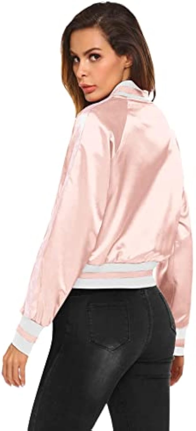 • Features:Long sleeve, zipper closure, lightweight jacket, stand collar, 2 pockets, classic and stylish. Two pockets are more convenient to secure your items, like credit cards, wallet or phone, satin bomber jacket, ladies satin crop letterman jacket.