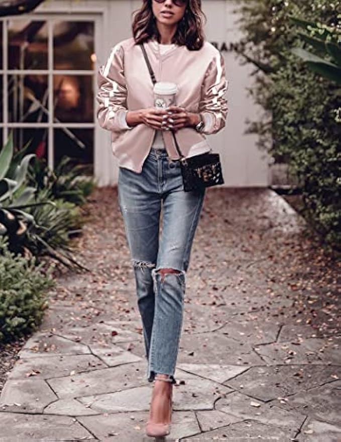 • Material: 100% Polyester. Lightweight, Breathable and Comfortable. this womens casual bomber jacket will keep the wind out and keep you warm. soft and flexible ,makes your confident wearing outside.This satin bomber jacket women suitable for the Spring, Autumn and Winter, bomber jacket women, varsity jacket women.