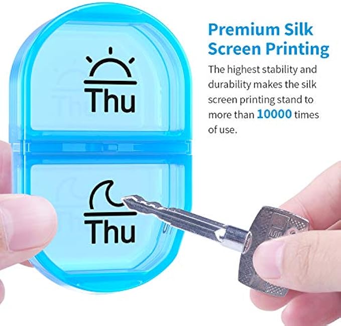 Premium Quality: After a period of use, some lid buckles may worn out and can’t close tightly to the medication box, which may cause the pills dumpage, however the lid buckle of this pills container can stand up to more than 9000 times of open/close, and merely 4-6N of force can open this pillboxes organizer, super friendly to arthritic! Test also proved the UV printed ink icon on the pill holders can stand up to more than 10000 times of use, no worry about the fade away icons!