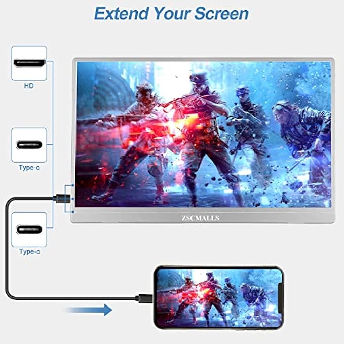 【Born for Portable】It is one of the thinnest and lightest portable monitors on the market. ZSCMALLS 15.6 inches portable monitor slim to 0.39 inch profile and only 1.76lb, ZSCMALLS portable screen idea for extending your screen or playing games on business trip, travel or work from home 【Plug and Play 】The USB C portable monitor has impressive feature of plug and play that doesn’t require any driver installation. Compatible with thunderbolt 3. Support mirror and split screen mode, increase your productivity and your gaming pleasurable, great choice for dual monitor or third screen 【FHD 1080P HDR】Using a 15.6'' advanced IPS screen with 178° wide viewing angle, Delivers 1920*1080 breathtaking viewing quality and HDR technology, portable gaming monitor has excellent color rendering ability, provide you the clearer, smooth, excellent performance in gaming/multimedia. It can effectively reduce blue light radiation damage, no flickering, eye-care, and make it easier to watch for a long time 【Widely Application】Portable display with USB C, mini HDMI and USB port make it easy connection with Laptops, PCs, Phones, PS3/PS4, XBOX ONE or Switch and mouse, keyboard to play business presentations, games, videos, TV series, photos etc 【Hassle-free service】Risk-free free trial for laptop monitor, if you have any problem with your ZSCMALLS portable monitor, please contact us for technical support or replacement.